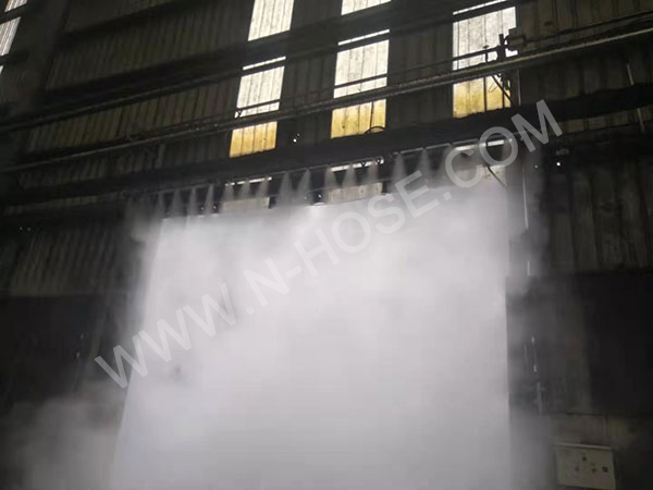 微米級干霧抑塵系統采用模塊化設計,由干霧主機、霧化終端系統、空壓機、儲氣罐、水氣連接管線、電伴熱系統和自動控制線路組成。